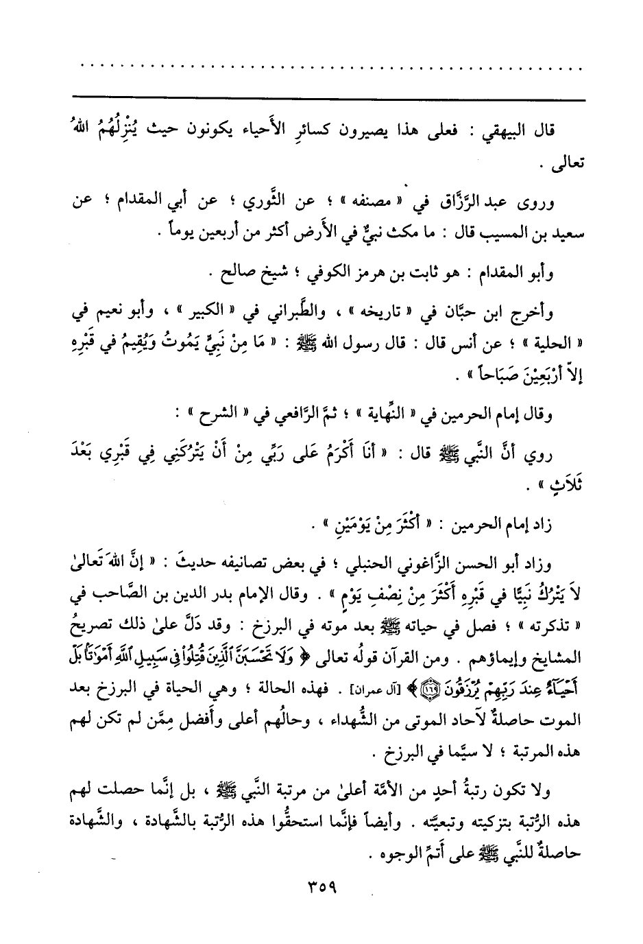 وزاد أبو الحسن الزّاغوني الحنبلي؛ في بعض تصانيفه حديث: «إنّ الله تعالى لا يترك نبيّا في قبره أكثر من نصف يوم» . وقال الإمام بدر الدين بن الصّاحب في «تذكرته» ؛ فصل في حياته صلى الله عليه وسلم بعد موته في البرزخ: وقد دلّ على ذلك تصريح المشايخ وإيماؤهم. ومن القرآن قوله تعالى وَلا تَحْسَبَنَّ الَّذِينَ قُتِلُوا فِي سَبِيلِ اللَّهِ أَمْواتاً بَلْ أَحْياءٌ عِنْدَ رَبِّهِمْ يُرْزَقُونَ (169) [آل عمران] . فهذه الحالة؛ وهي الحياة في البرزخ بعد الموت حاصلة لآحاد الموتى من الشّهداء، وحالهم أعلى وأفضل ممّن لم تكن لهم هذه المرتبة؛ لا سيّما في البرزخ.