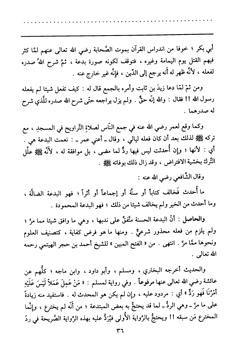 والحاصل: أنّ البدعة الحسنة متّفق على ندبها، وهي ما وافق شيئا مما مرّ؛ ولم يلزم من فعله محذور شرعيّ. ومنها ما هو فرض كفاية، كتصنيف العلوم ونحوها ممّا مرّ. انتهى. من «الفتح المبين» للشيخ أحمد بن حجر الهيتمي رحمه الله تعالى.