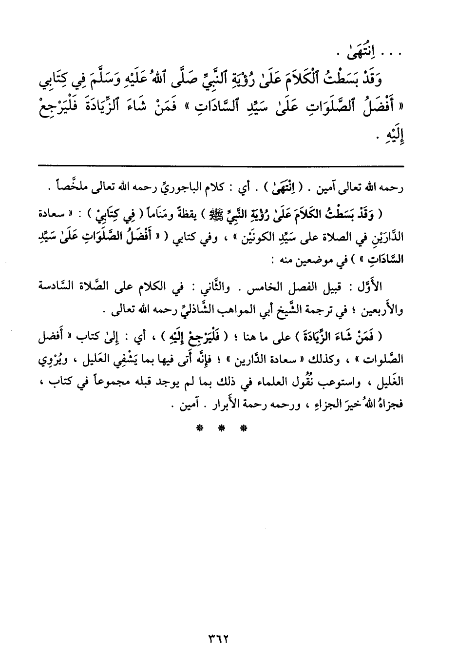 (فمن شاء الزّيادة) على ما هنا؛ (فليرجع إليه) ، أي: إلى كتاب «أفضل الصّلوات» ، وكذلك «سعادة الدّارين» ؛ فإنّه أتى فيها بما يشفي العليل، ويروي الغليل، واستوعب نقول العلماء في ذلك بما لم يوجد قبله مجموعا في كتاب، فجزاه الله خير الجزاء، ورحمه رحمة الأبرار. آمين.