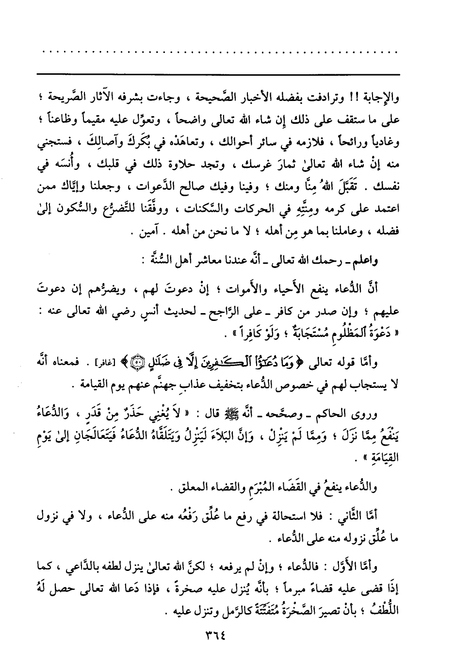 والإجابة!! وترادفت بفضله الأخبار الصّحيحة، وجاءت بشرفه الآثار الصّريحة؛ على ما ستقف على ذلك إن شاء الله تعالى واضحا، وتعوّل عليه مقيما وظاعنا؛ وغاديا ورائحا، فلازمه في سائر أحوالك، وتعاهده في بكرك وآصالك، فستجني منه إن شاء الله تعالى ثمار غرسك، وتجد حلاوة ذلك في قلبك، وأنسه في نفسك. تقبّل الله منّا ومنك؛ وفينا وفيك صالح الدّعوات، وجعلنا وإيّاك ممن اعتمد على كرمه ومنّته في الحركات والسّكنات، ووفّقنا للتّضرّع والسّكون إلى فضله، وعاملنا بما هو من أهله؛ لا ما نحن من أهله. آمين.