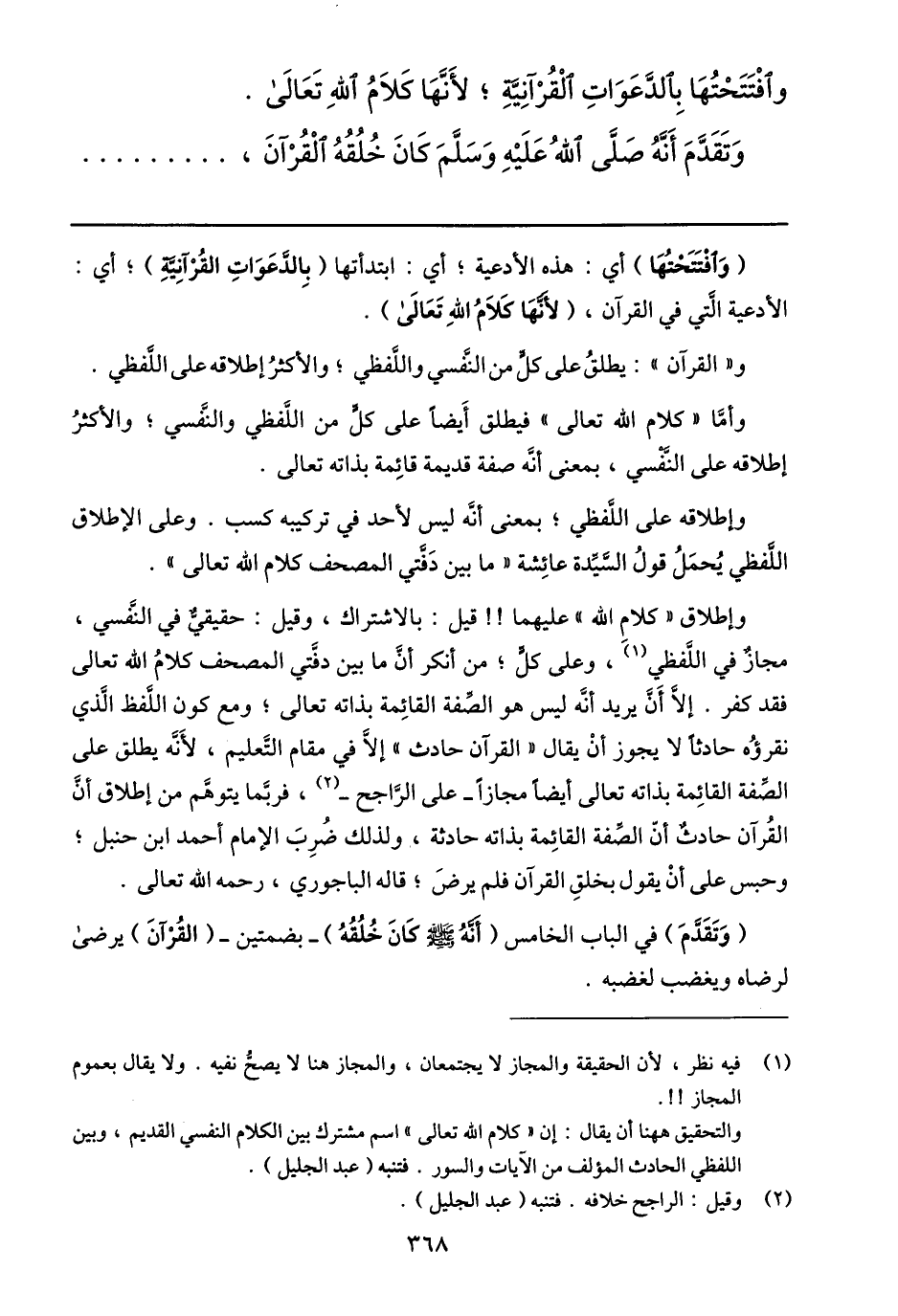 (1) فيه نظر، لأن الحقيقة والمجاز لا يجتمعان، والمجاز هنا لا يصحّ نفيه. ولا يقال بعموم المجاز!!. والتحقيق ههنا أن يقال: إن «كلام الله تعالى» اسم مشترك بين الكلام النفسي القديم، وبين اللفظي الحادث المؤلف من الآيات والسور. فتنبه (عبد الجليل) .