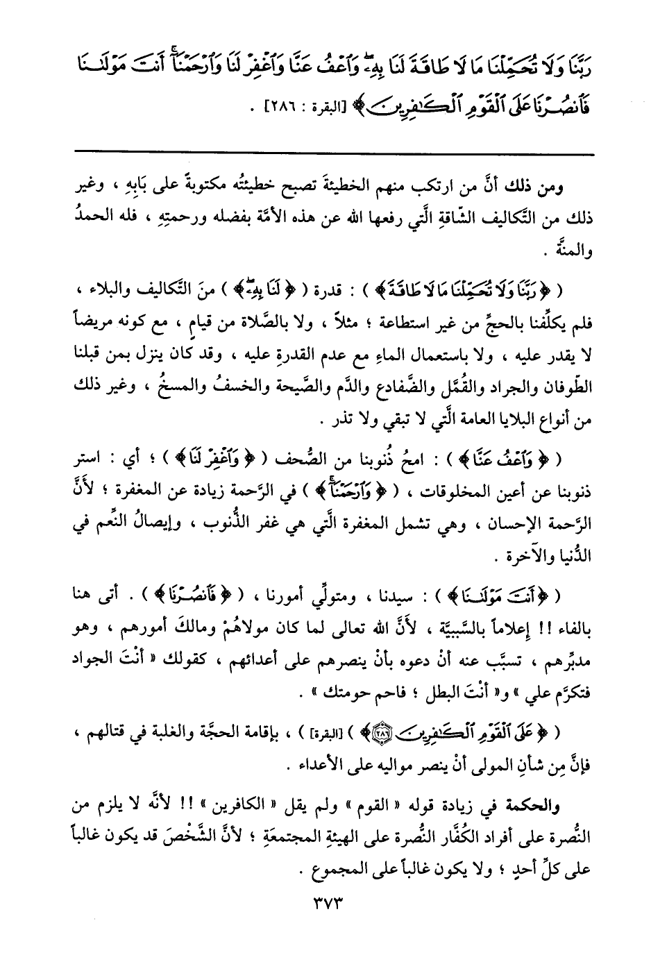 رَبَّنا وَلا تُحَمِّلْنا ما لا طاقَةَ لَنا بِهِ وَاعْفُ عَنَّا وَاغْفِرْ لَنا وَارْحَمْنا أَنْتَ مَوْلانا فَانْصُرْنا عَلَى الْقَوْمِ الْكافِرِينَ [البقرة: 286] .