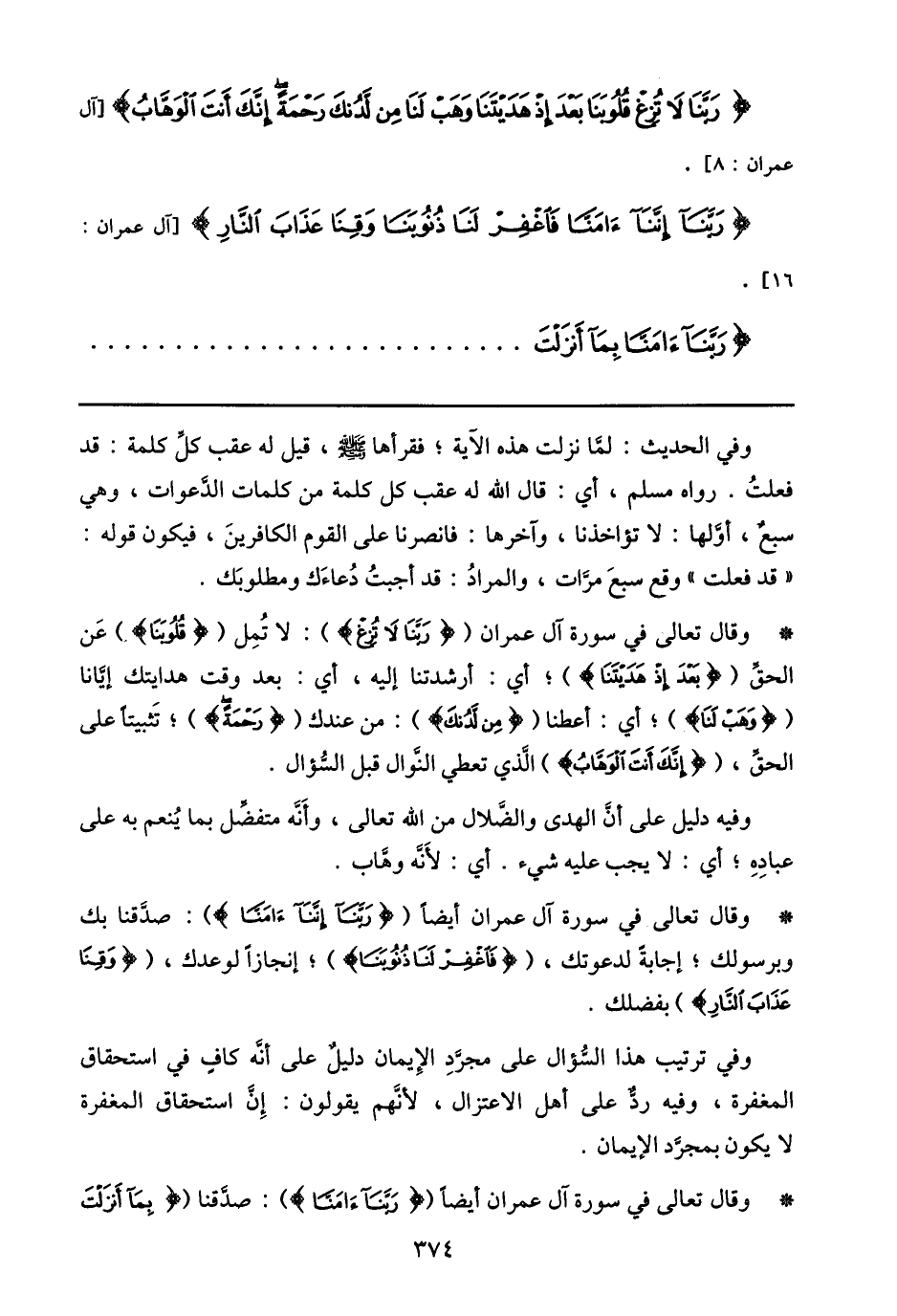 * وقال تعالى في سورة آل عمران (رَبَّنا لا تُزِغْ) : لا تمل (قُلُوبَنا) عن الحقّ (بَعْدَ إِذْ هَدَيْتَنا) ؛ أي: أرشدتنا إليه، أي: بعد وقت هدايتك إيّانا (وَهَبْ لَنا) ؛ أي: أعطنا (مِنْ لَدُنْكَ) : من عندك (رَحْمَةً) ؛ تثبيتا على الحقّ، (إِنَّكَ أَنْتَ الْوَهَّابُ) الّذي تعطي النّوال قبل السّؤال.