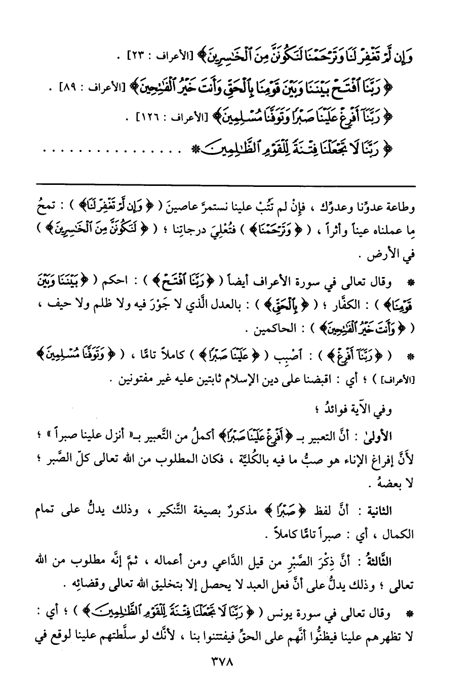 * (رَبَّنا أَفْرِغْ) : اصبب (عَلَيْنا صَبْراً) كاملا تامّا، (وَتَوَفَّنا مُسْلِمِينَ [الأعراف] ) ؛ أي: اقبضنا على دين الإسلام ثابتين عليه غير مفتونين.