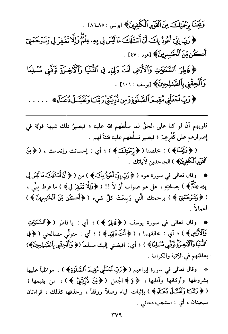 * وقال تعالى في سورة يوسف (فاطِرَ) ؛ أي: يا فاطر (السَّماواتِ وَالْأَرْضِ) ؛ أي: خالقهما، (أَنْتَ وَلِيِّي) ؛ أي: متولّي مصالحي (فِي الدُّنْيا وَالْآخِرَةِ تَوَفَّنِي مُسْلِماً) ؛ أي: اقبضني إليك مسلما (وَأَلْحِقْنِي بِالصَّالِحِينَ) بعامّتهم في الرّتبة والكرامة.