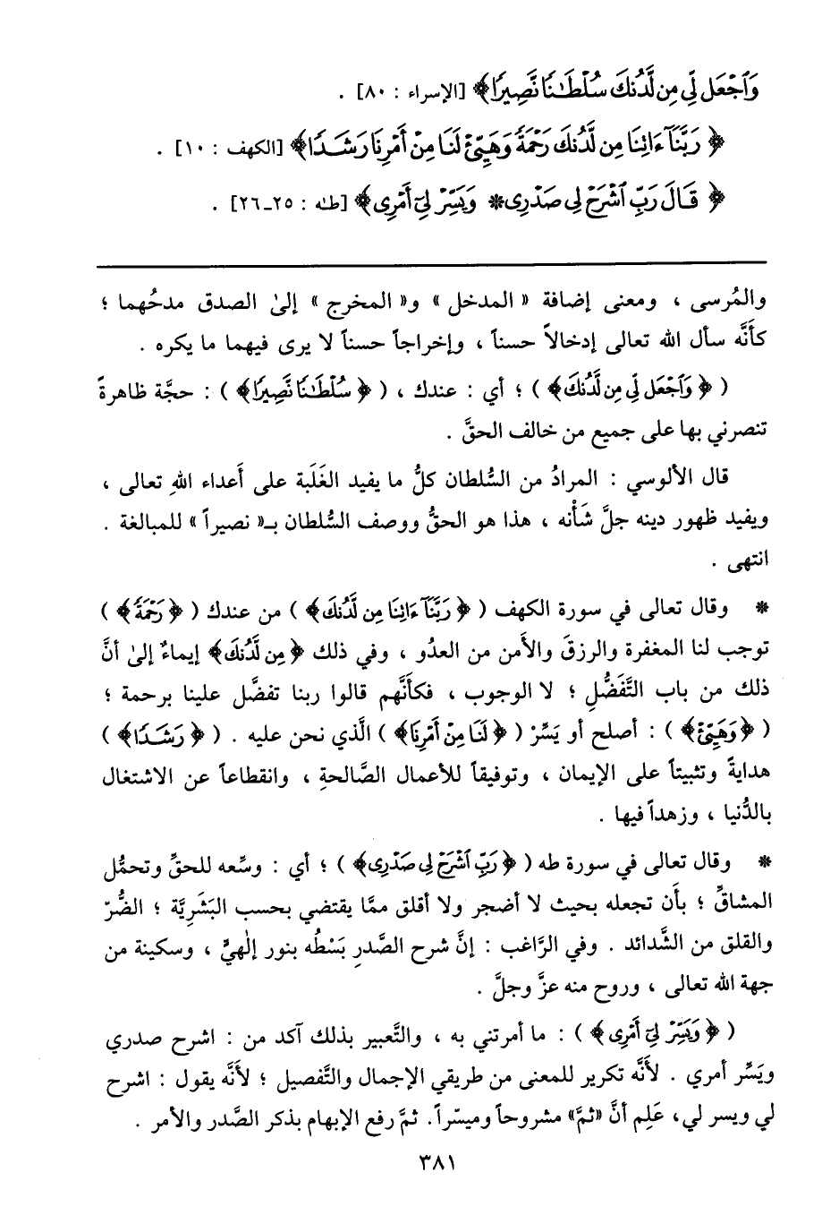 والمرسى، ومعنى إضافة «المدخل» و «المخرج» إلى الصدق مدحهما؛ كأنّه سأل الله تعالى إدخالا حسنا، وإخراجا حسنا لا يرى فيهما ما يكره.