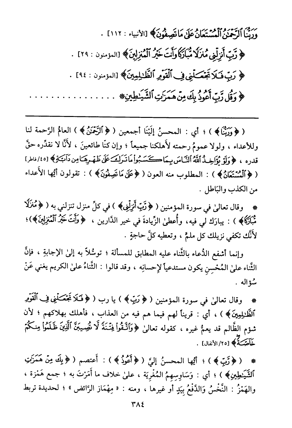 * وقال تعالى في سورة المؤمنين (رَبِّ أَنْزِلْنِي) في كلّ منزل تنزلني به (مُنْزَلًا مُبارَكاً) : يبارك لي فيه، وأعطى الزّيادة في خير الدّارين، وَأَنْتَ خَيْرُ الْمُنْزِلِينَ) ؛ لأنّك تكفي نزيلك كل ملمّ، وتعطيه كلّ حاجة.