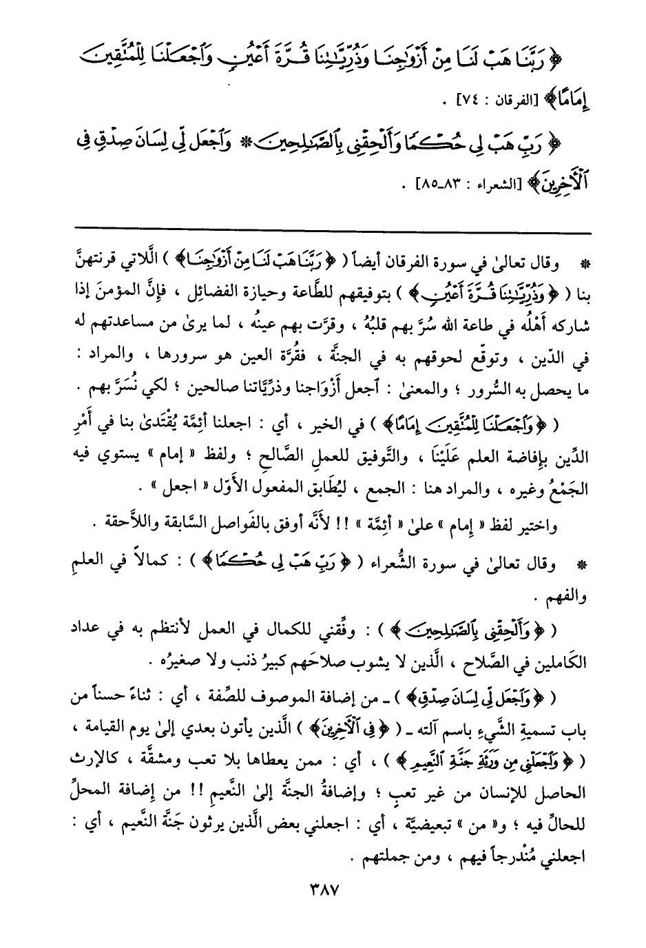 رَبَّنا هَبْ لَنا مِنْ أَزْواجِنا وَذُرِّيَّاتِنا قُرَّةَ أَعْيُنٍ وَاجْعَلْنا لِلْمُتَّقِينَ إِماماً [الفرقان: 74] .
