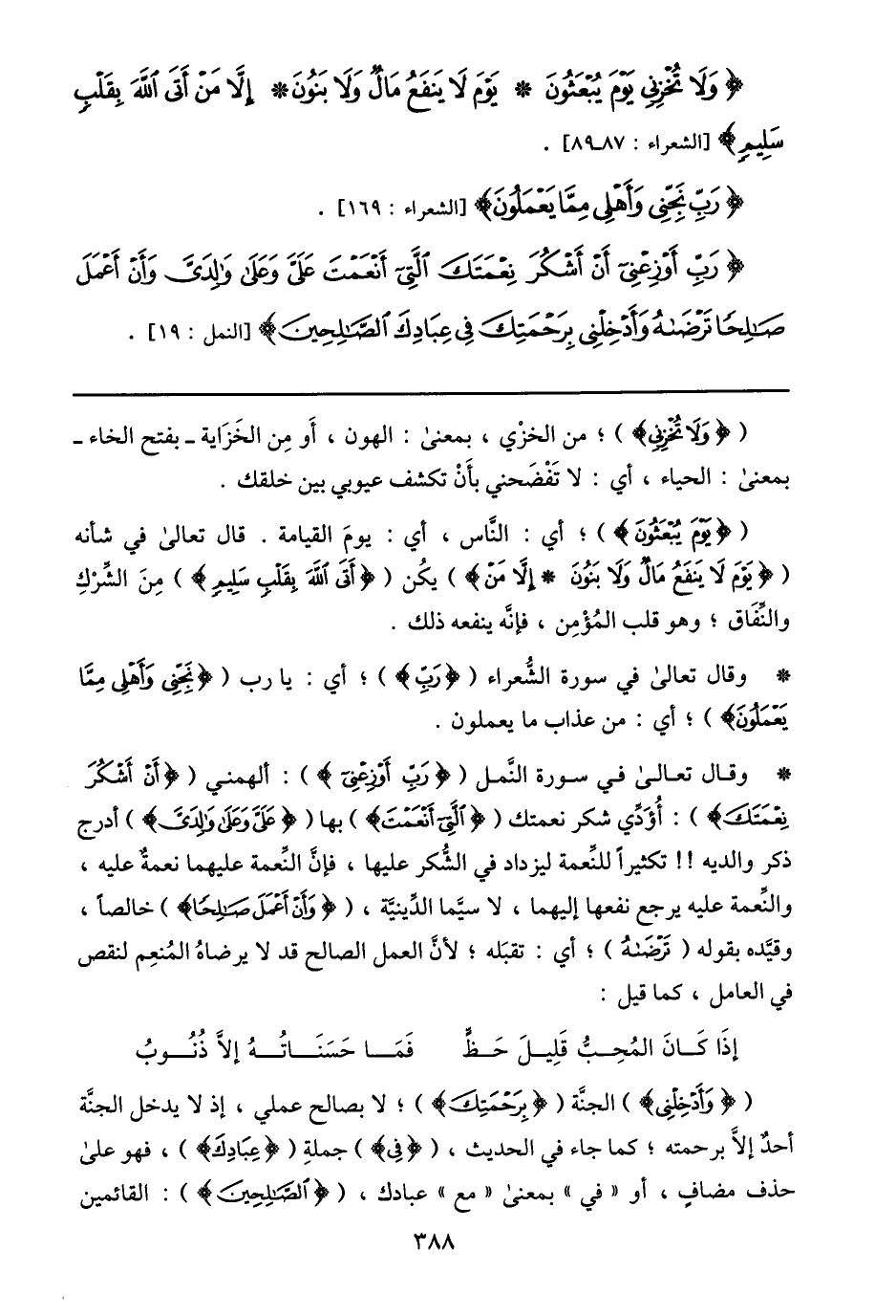 وَلا تُخْزِنِي يَوْمَ يُبْعَثُونَ. يَوْمَ لا يَنْفَعُ مالٌ وَلا بَنُونَ. إِلَّا مَنْ أَتَى اللَّهَ بِقَلْبٍ سَلِيمٍ [الشعراء: 87- 89] .