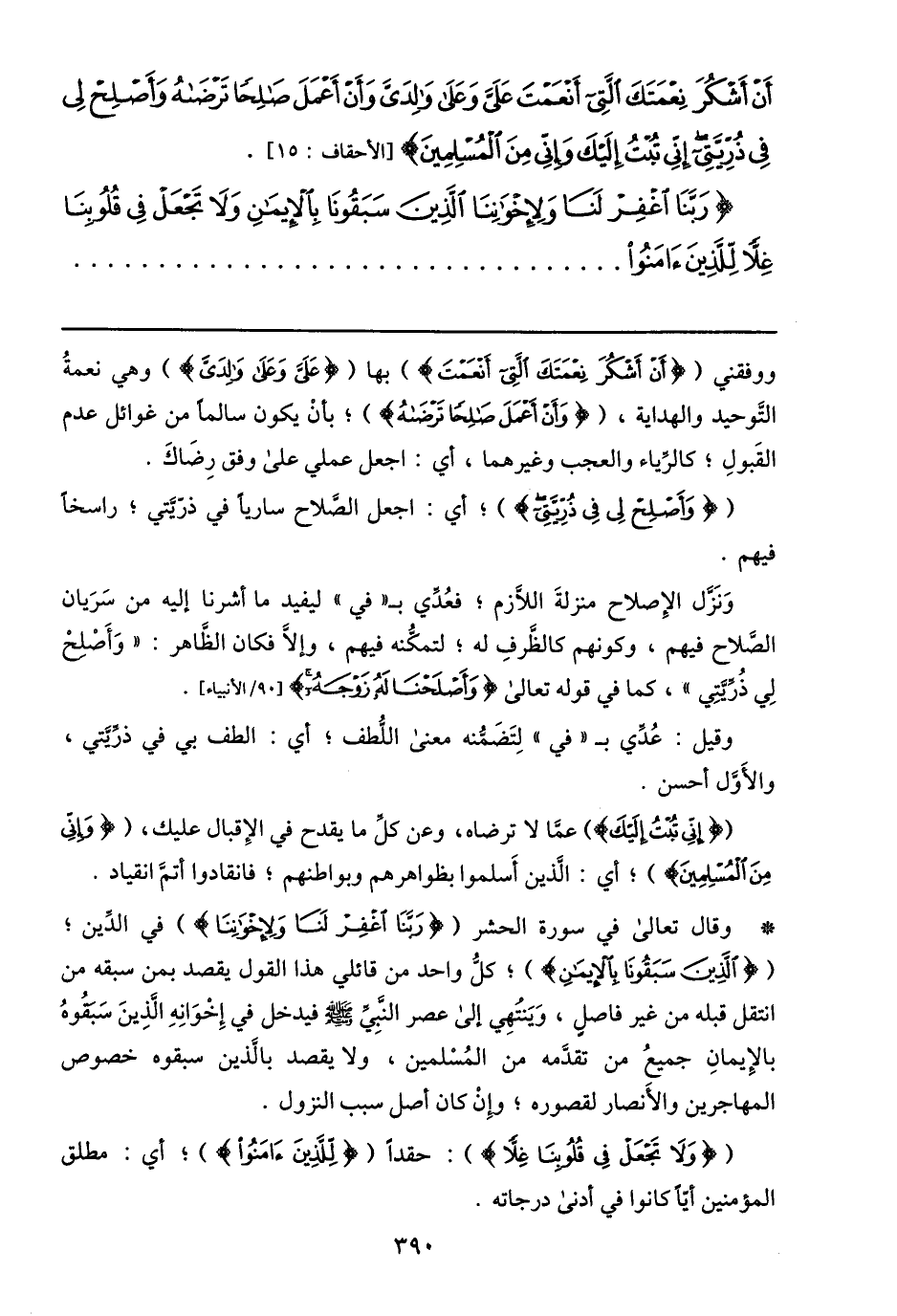 أَنْ أَشْكُرَ نِعْمَتَكَ الَّتِي أَنْعَمْتَ عَلَيَّ وَعَلى والِدَيَّ وَأَنْ أَعْمَلَ صالِحاً تَرْضاهُ وَأَصْلِحْ لِي فِي ذُرِّيَّتِي إِنِّي تُبْتُ إِلَيْكَ وَإِنِّي مِنَ الْمُسْلِمِينَ [الأحقاف: 15] .
