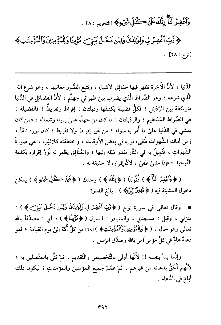 وإنّما بدأ بنفسه!! لأنّها أولى بالتّخصيص والتّقديم، ثمّ ثنّى بالمتّصلين به؛ لأنّهم أحقّ بدعائه من غيرهم، ثمّ عمّم جميع المؤمنين والمؤمنات؛ ليكون ذلك أبلغ في الدّعاء.