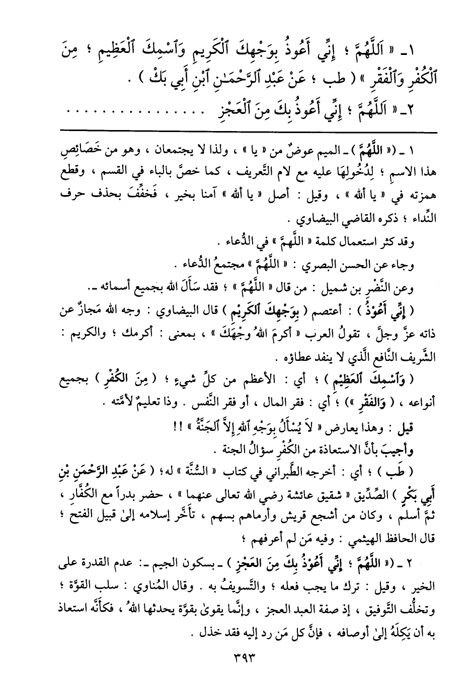 1- «اللهمّ؛ إنّي أعوذ بوجهك الكريم واسمك العظيم؛ من الكفر والفقر» (طب؛ عن عبد الرّحمن ابن أبي بك) .