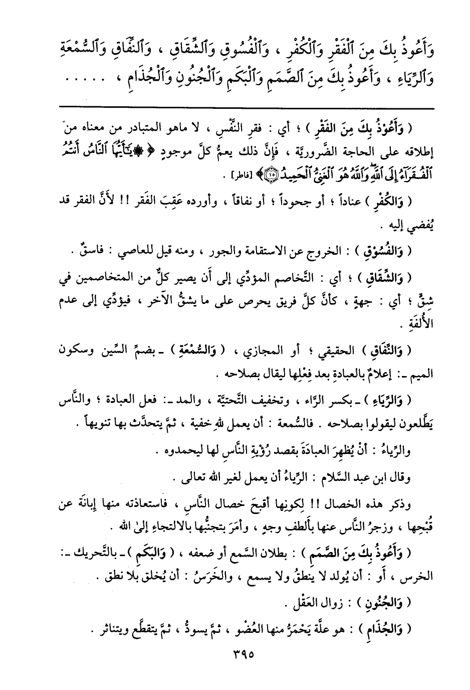 وأعوذ بك من الفقر والكفر، والفسوق والشّقاق، والنّفاق والسّمعة والرّياء، وأعوذ بك من الصّمم والبكم والجنون والجذام، ...
