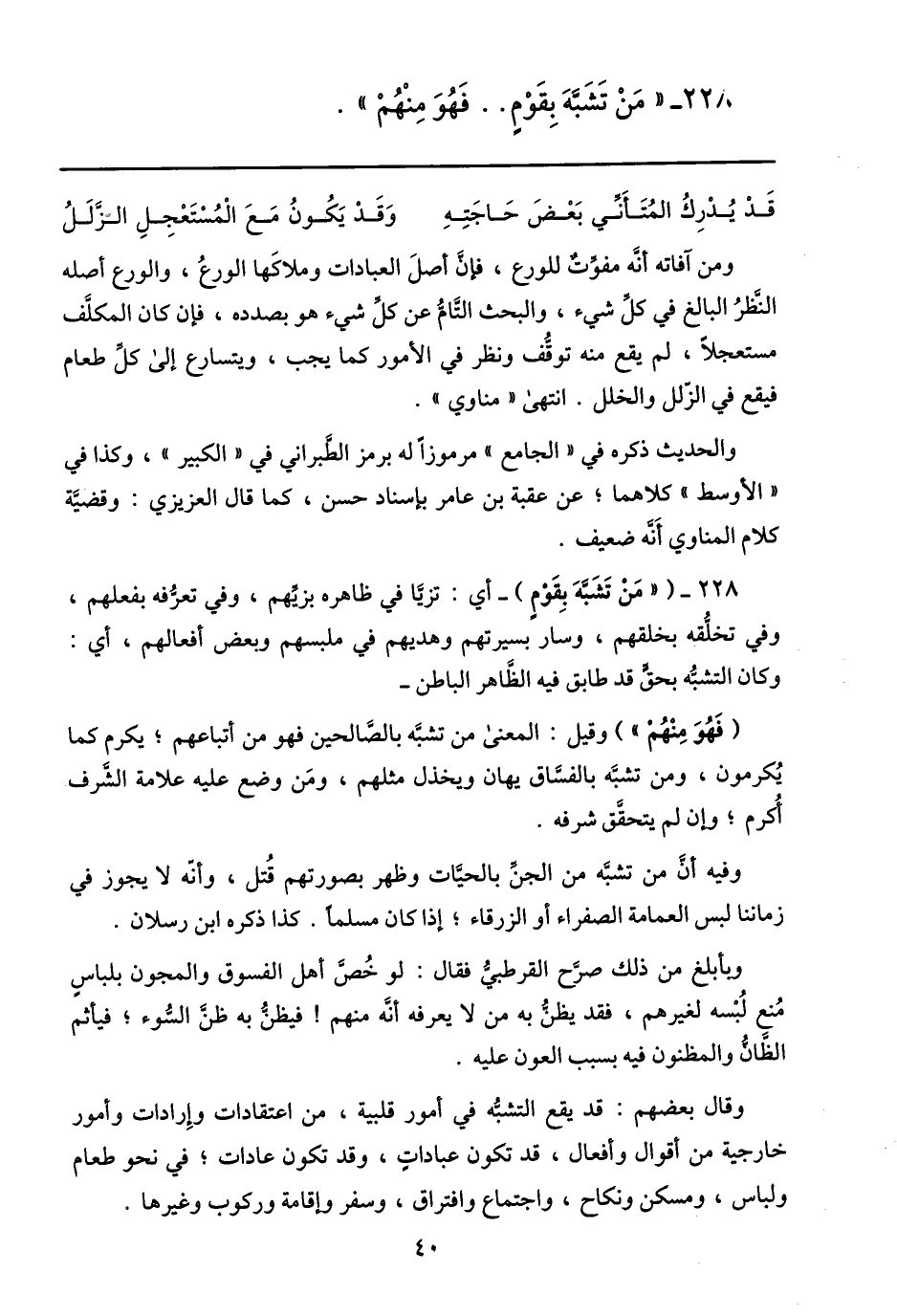 228- ( «من تشبّه بقوم) - أي: تزيّا في ظاهره بزيّهم، وفي تعرّفه بفعلهم، وفي تخلّقه بخلقهم، وسار بسيرتهم وهداهم في ملبسهم وبعض أفعالهم، أي: