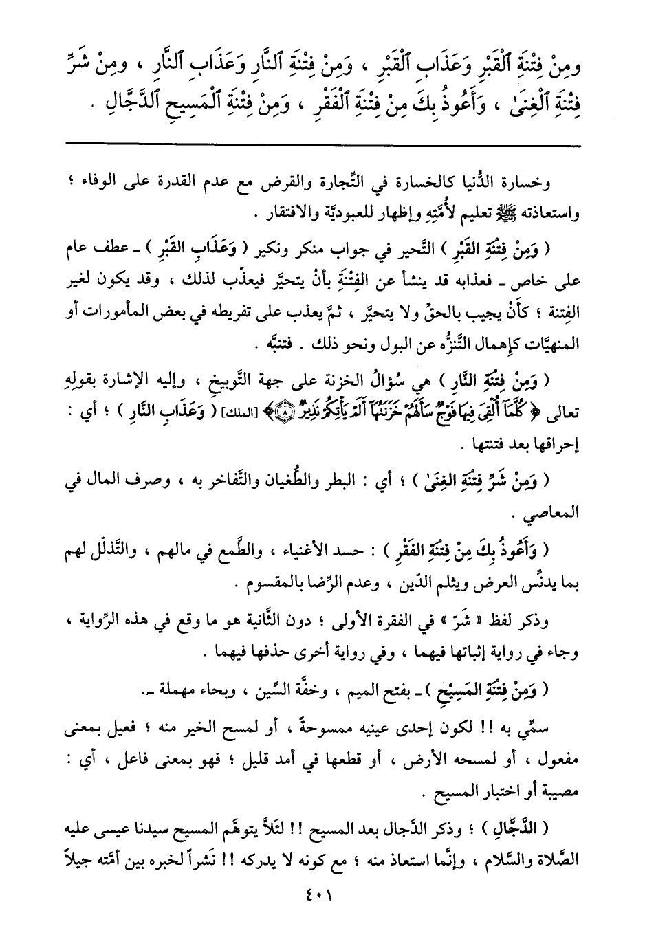 ومن فتنة القبر وعذاب القبر، ومن فتنة النّار وعذاب النّار، ومن شرّ فتنة الغنى، وأعوذ بك من فتنة الفقر، ومن فتنة المسيح الدّجّال.