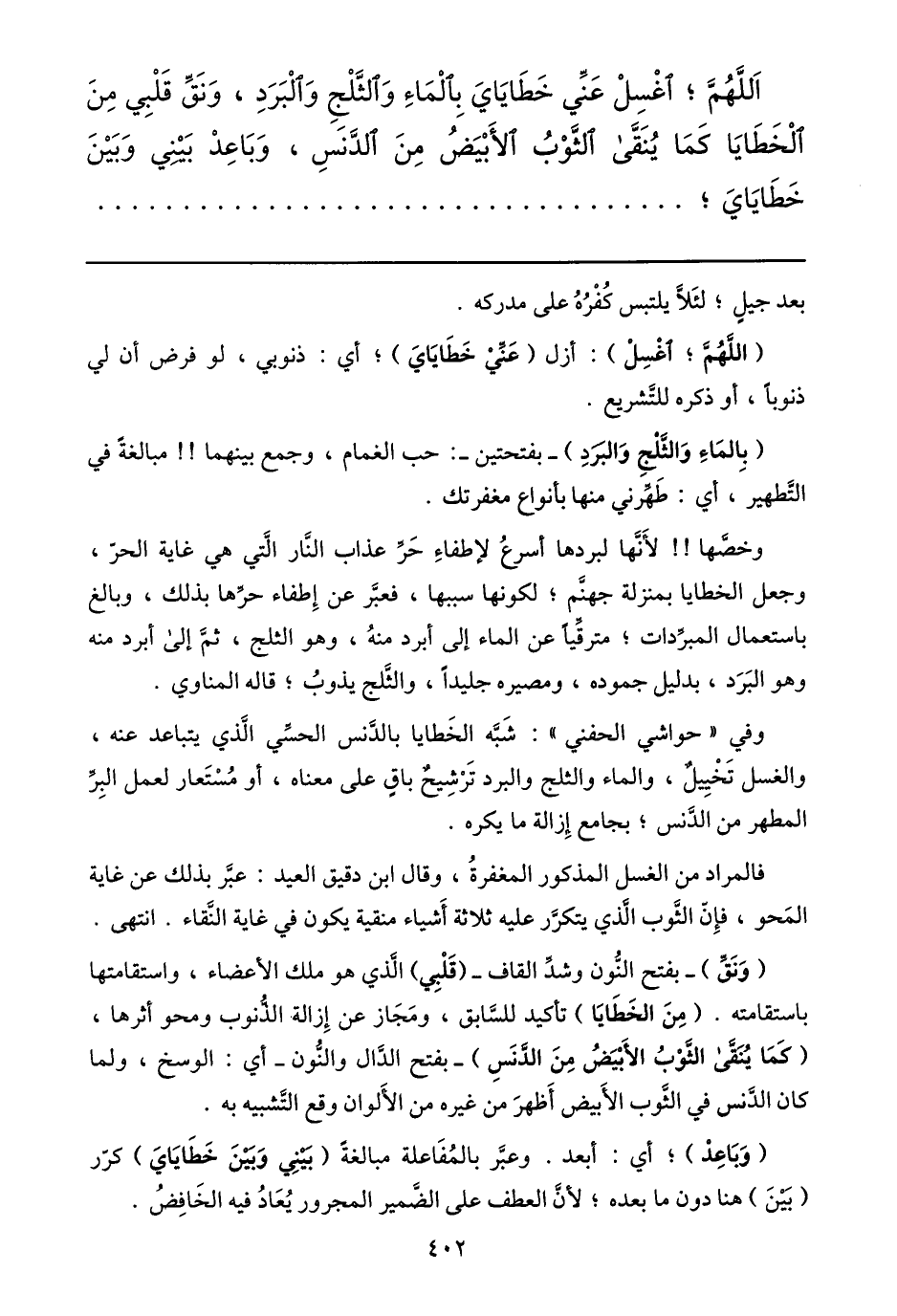 اللهمّ؛ اغسل عنّي خطاياي بالماء والثّلج والبرد، ونقّ قلبي من الخطايا كما ينقّى الثّوب الأبيض من الدّنس، وباعد بيني وبين خطاياي؛ ...