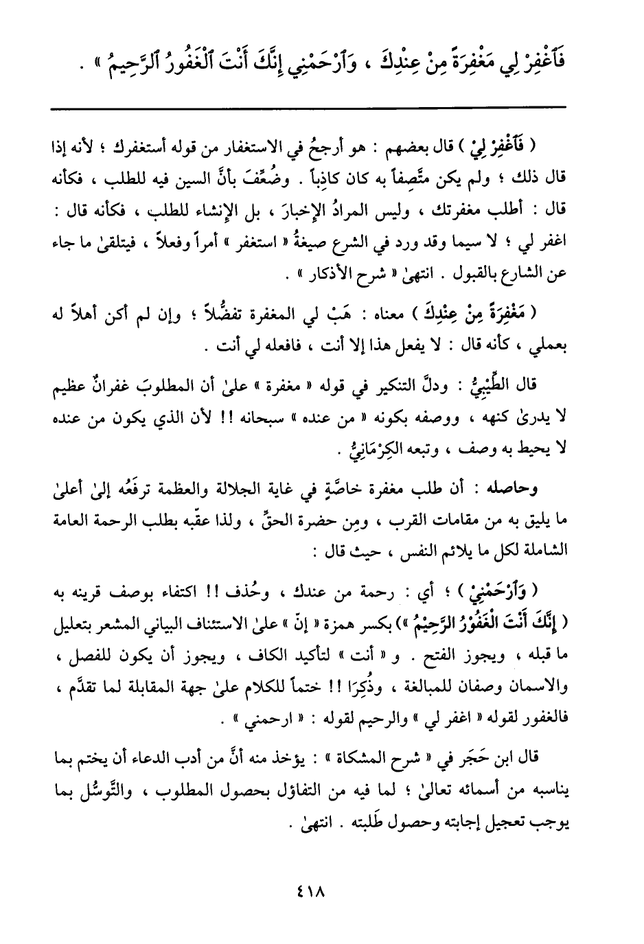 قال الطّيبيّ: ودلّ التنكير في قوله «مغفرة» على أن المطلوب غفران عظيم لا يدرى كنهه، ووصفه بكونه «من عنده» سبحانه!! لأن الذي يكون من عنده لا يحيط به وصف، وتبعه الكرمانيّ.