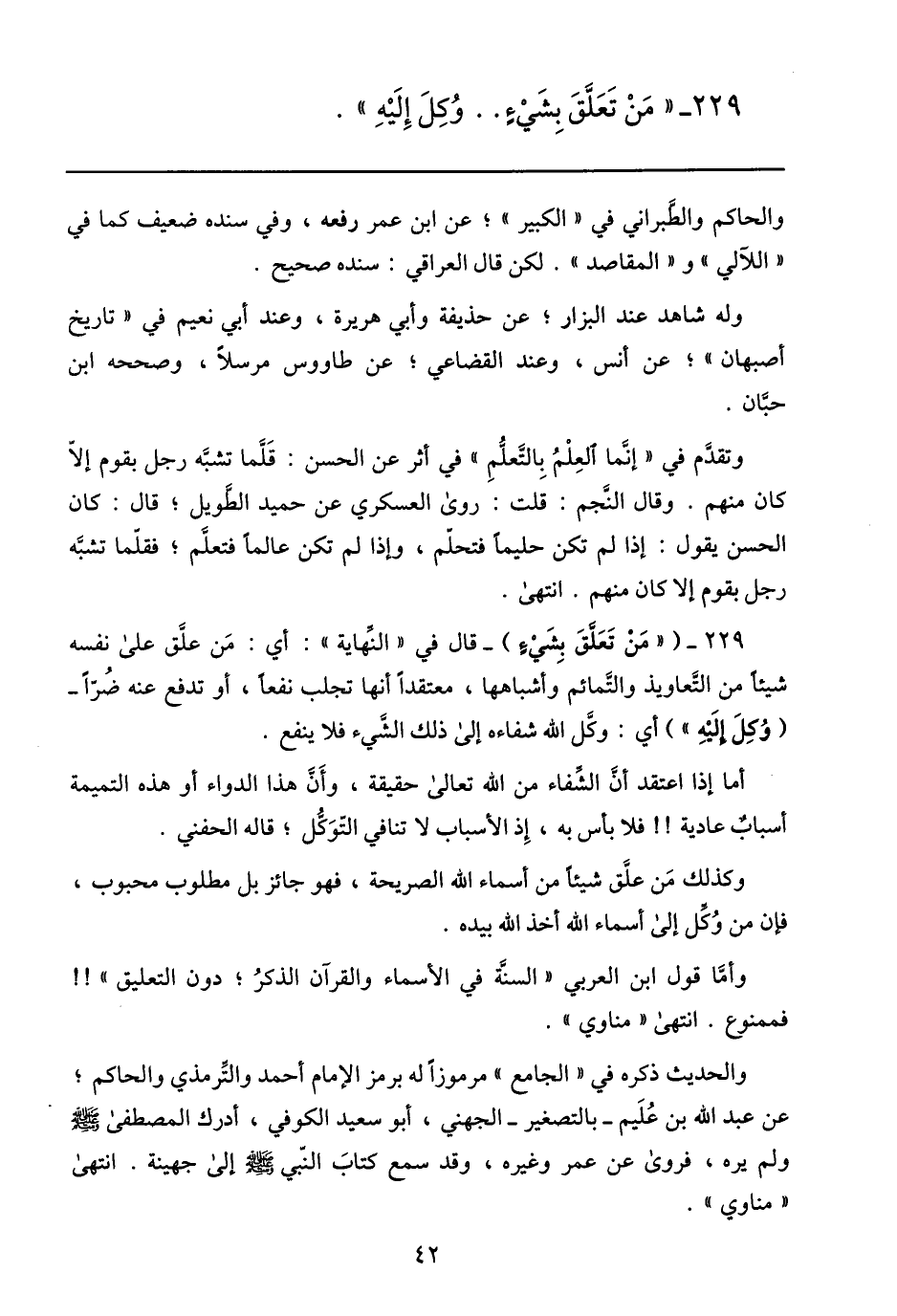 229- ( «من تعلّق بشيء) - قال في «النّهاية» : أي: من علّق على نفسه شيئا من التّعاويذ والتّمائم وأشباهها، معتقدا أنها تجلب نفعا، أو تدفع عنه ضرّا- (وكل إليه» ) أي: وكلّ الله شفاءه إلى ذلك الشّيء فلا ينفع.