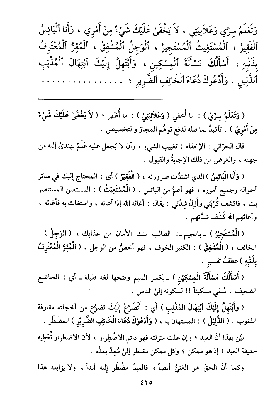 وتعلم سرّي وعلانيتي، لا يخفى عليك شيء من أمري، وأنا البائس الفقير، المستغيث المستجير، الوجل المشفق، المقرّ المعترف بذنبه، أسألك مسألة المسكين، وأبتهل إليك ابتهال المذنب الذّليل، وأدعوك دعاء الخائف الضّرير؛ ...