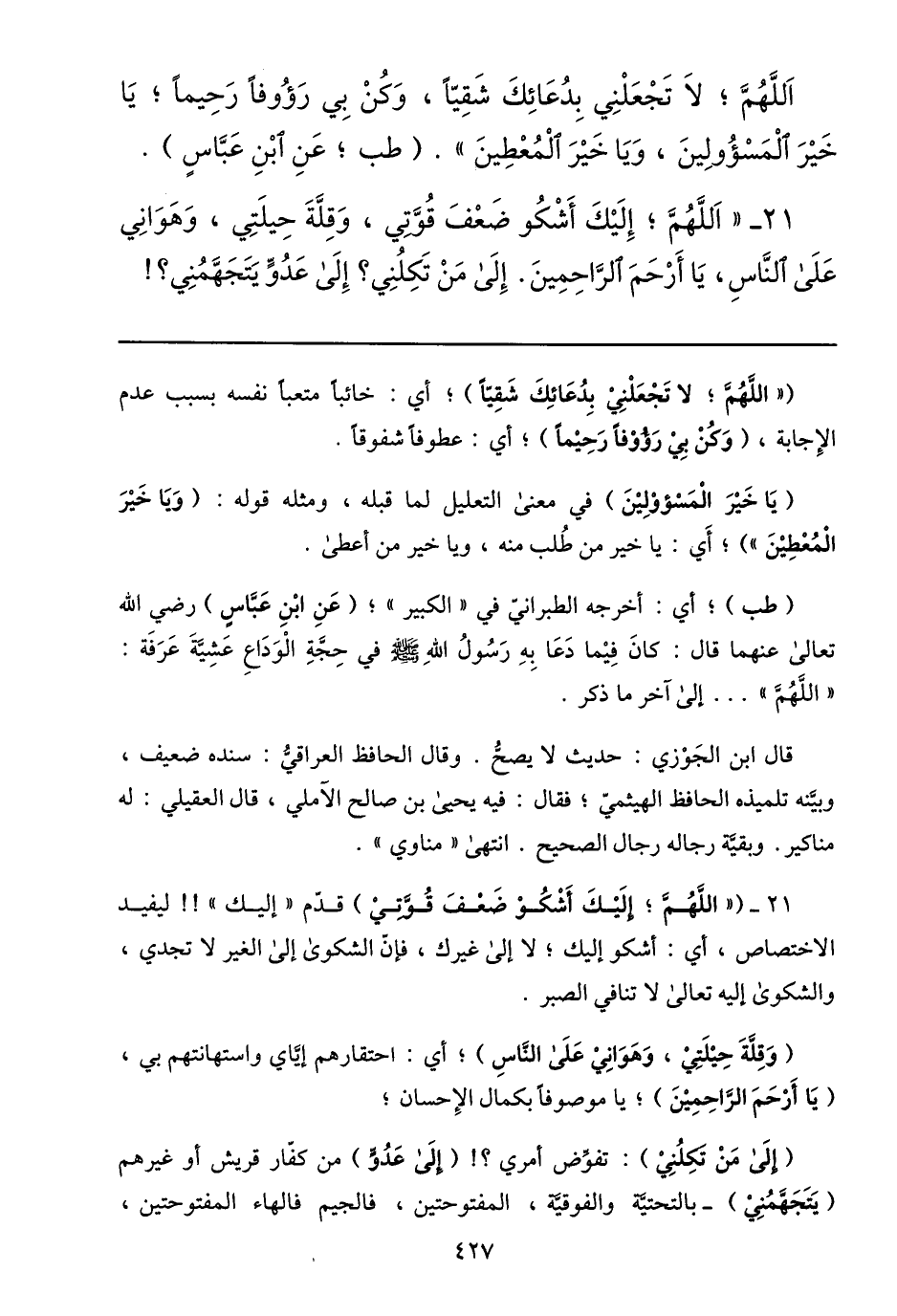 21- «اللهمّ؛ إليك أشكو ضعف قوّتي، وقلّة حيلتي، وهواني على النّاس، يا أرحم الرّاحمين. إلى من تكلني؟ إلى عدوّ يتجهّمني؟!