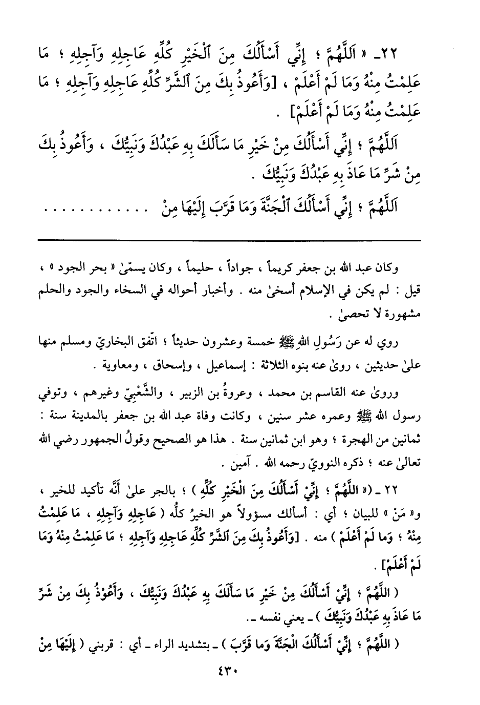 22- ( «اللهمّ؛ إنّي أسألك من الخير كلّه) ؛ بالجر على أنّه تأكيد للخير، و «من» للبيان؛ أي: أسألك مسؤولا هو الخير كلّه (عاجله وآجله، ما علمت منه؛ وما لم أعلم) منه. [وأعوذ بك من الشّرّ كلّه عاجله وآجله؛ ما علمت منه وما لم أعلم] .