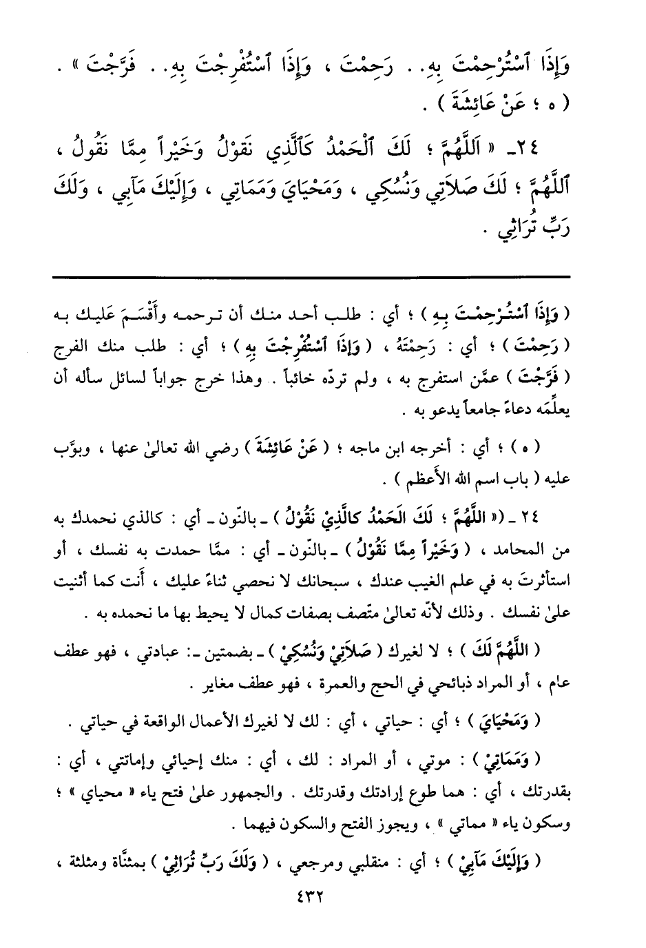 24- «اللهمّ؛ لك الحمد كالّذي نقول وخيرا ممّا نقول، اللهمّ؛ لك صلاتي ونسكي، ومحياي ومماتي، وإليك مابي، ولك ربّ تراثي.