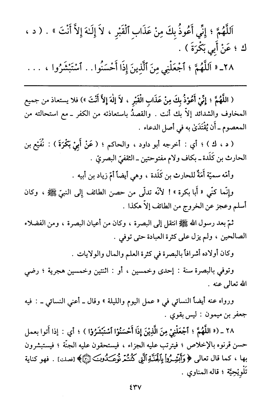 28- ( «اللهمّ؛ اجعلني من الّذين إذا أحسنوا استبشروا) ؛ أي: إذا أتوا بعمل حسن قرنوه بالإخلاص؛ فيترتب عليه الجزاء، فيستحقون عليه الجنّة؛ فيستبشرون بها، كما قال تعالى وَأَبْشِرُوا بِالْجَنَّةِ الَّتِي كُنْتُمْ تُوعَدُونَ (30) [فصلت] . فهو كناية تلويحيّة؛ قاله المناوي.