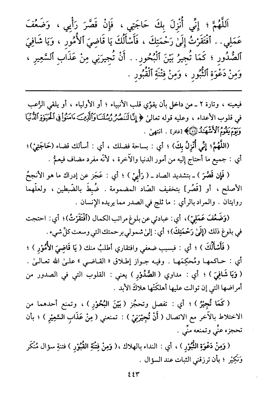 اللهمّ؛ إنّي أنزل بك حاجتي، فإن قصّر رأيي، وضعف عملي.. افتقرت إلى رحمتك، فأسألك يا قاضي الأمور، ويا شافي الصّدور؛ كما تجير بين البحور.. أن تجيرني من عذاب السّعير، ومن دعوة الثّبور، ومن فتنة القبور.