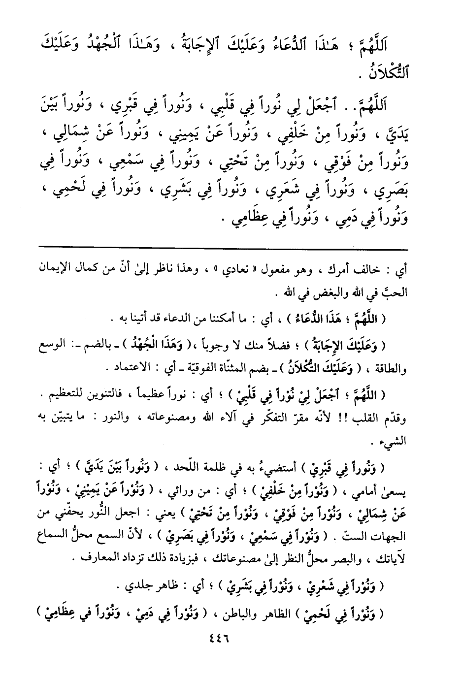 اللهمّ.. اجعل لي نورا في قلبي، ونورا في قبري، ونورا بين يديّ، ونورا من خلفي، ونورا عن يميني، ونورا عن شمالي، ونورا من فوقي، ونورا من تحتي، ونورا في سمعي، ونورا في بصري، ونورا في شعري، ونورا في بشري، ونورا في لحمي، ونورا في دمي، ونورا في عظامي.