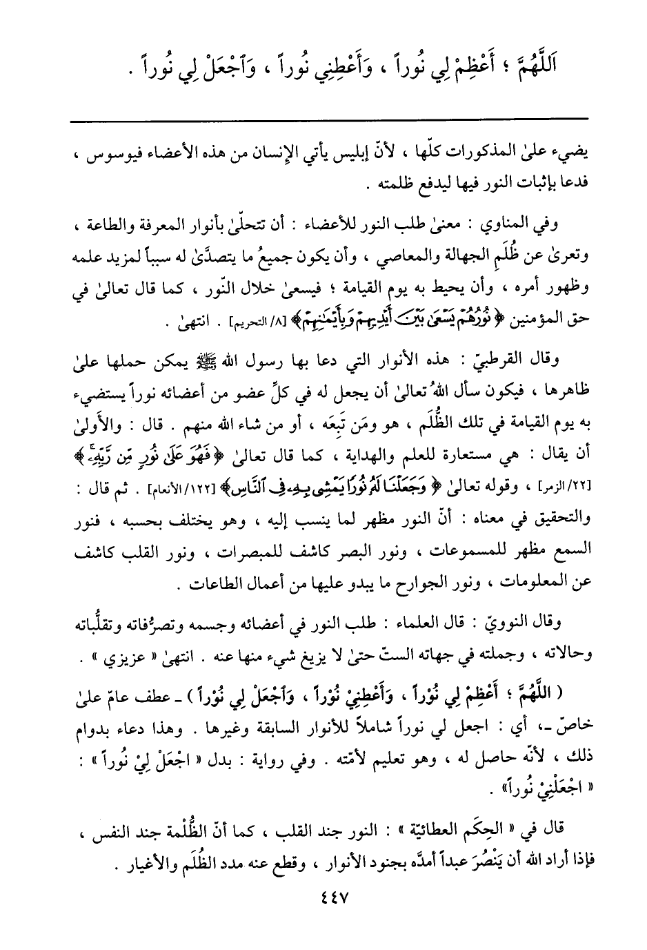 وفي المناوي: معنى طلب النور للأعضاء: أن تتحلّى بأنوار المعرفة والطاعة، وتعرى عن ظلم الجهالة والمعاصي، وأن يكون جميع ما يتصدّى له سببا لمزيد علمه وظهور أمره، وأن يحيط به يوم القيامة؛ فيسعى خلال النّور، كما قال تعالى في حق المؤمنين نُورُهُمْ يَسْعى بَيْنَ أَيْدِيهِمْ وَبِأَيْمانِهِمْ [8/ التحريم] . انتهى.