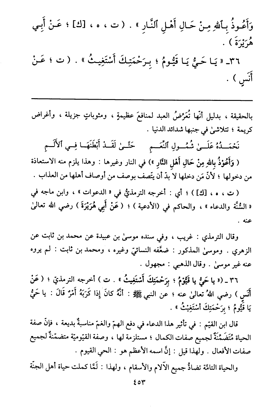 36- ( «يا حيّ يا قيّوم؛ برحمتك أستغيث» . ت) أخرجه الترمذيّ؛ (عن أنس) رضي الله تعالى عنه؛ عن النبي صلى الله عليه وسلم: أنّه كان إذا كربه أمر قال: يا حيّ يا قيّوم؛ برحمتك أستغيث» .