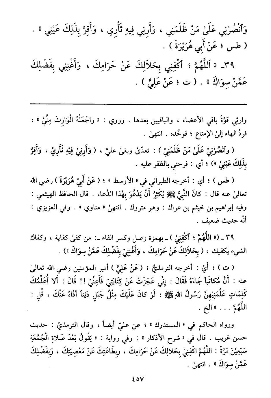 39- ( «اللهمّ؛ اكفني) - بهمزة وصل وكسر الفاء-: من كفى كفاية، وكفاك الشيء يكفيك، (بحلالك عن حرامك، وأغنني بفضلك عمّن سواك» ) .