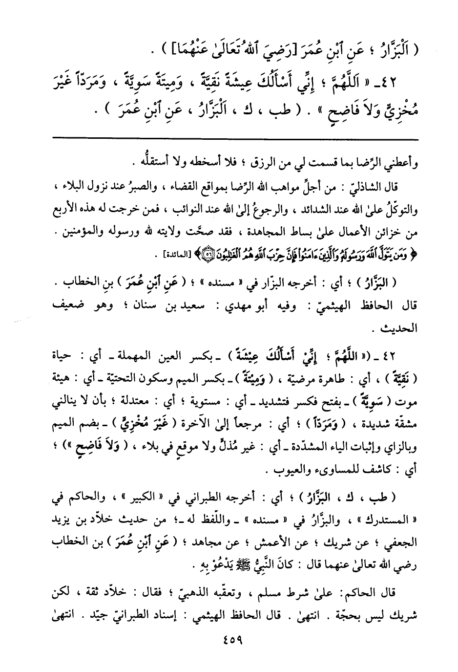 42- «اللهمّ؛ إنّي أسألك عيشة نقيّة، وميتة سويّة، ومردّا غير مخزيّ ولا فاضح» . (طب، ك، البزّار، عن ابن عمر) .