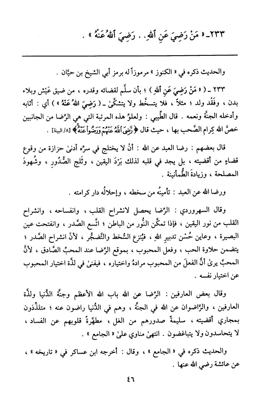 وقال بعض العارفين: الرّضا عن الله باب الله الأعظم وجنّة الدّنيا ولذّة العارفين، والرّاضوان عن الله في الجنّة، وهم في الدّنيا راضون عنه؛ متلذّذون بمجاري أقضيته، سليمة صدورهم من الغل، مطهّرة قلوبهم عن الفساد، لا يتحاسدون ولا يتباغضون. انتهى مناوي على «الجامع» .
