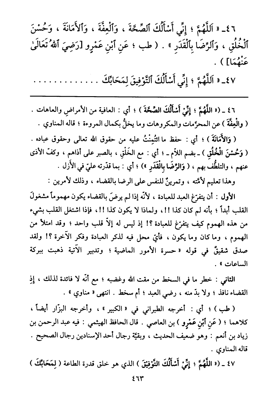 46- «اللهمّ؛ إنّي أسألك الصّحّة، والعفّة، والأمانة، وحسن الخلق، والرّضا بالقدر» . (طب؛ عن ابن عمرو [رضي الله تعالى عنهما] ) .