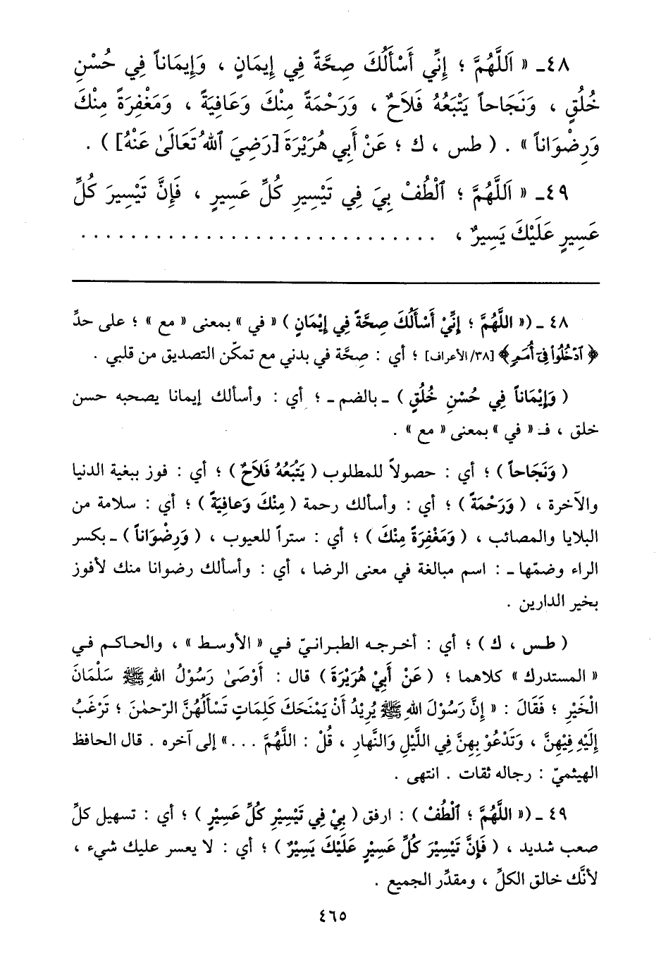 49- ( «اللهمّ؛ الطف) : ارفق (بي في تيسير كلّ عسير) ؛ أي: تسهيل كلّ صعب شديد، (فإنّ تيسير كلّ عسير عليك يسير) ؛ أي: لا يعسر عليك شيء، لأنّك خالق الكلّ، ومقدّر الجميع.