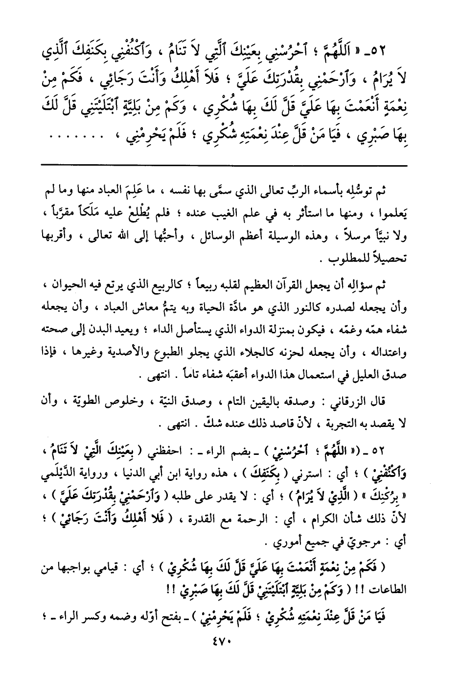 52- ( «اللهمّ؛ احرسني) - بضم الراء-: احفظني (بعينك الّتي لا تنام، واكنفني) ؛ أي: استرني (بكنفك) ، هذه رواية ابن أبي الدنيا، ورواية الدّيلمي «بركنك» (الّذي لا يرام) ؛ أي: لا يقدر على طلبه (وارحمني بقدرتك عليّ) ، لأنّ ذلك شأن الكرام، أي: الرحمة مع القدرة، (فلا أهلك وأنت رجائي) ؛ أي: مرجويّ في جميع أموري.