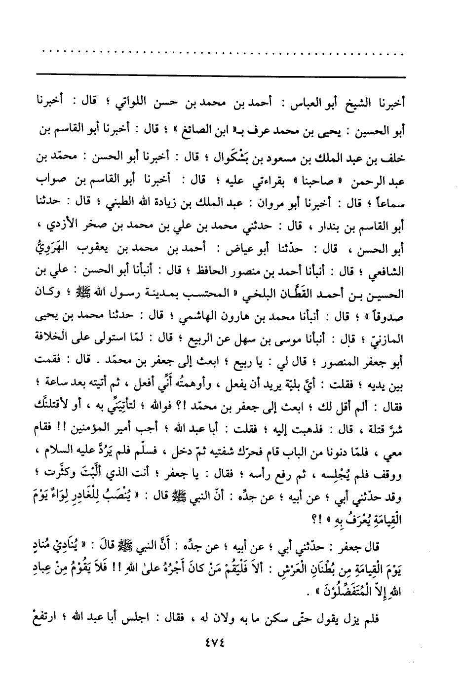 أخبرنا الشيخ أبو العباس: أحمد بن محمد بن حسن اللواتي؛ قال: أخبرنا أبو الحسين: يحيى بن محمد عرف ب «ابن الصائغ» ؛ قال: أخبرنا أبو القاسم بن خلف بن عبد الملك بن مسعود بن بشكوال؛ قال: أخبرنا أبو الحسن: محمّد بن عبد الرحمن «صاحبنا» بقراءتي عليه؛ قال: أخبرنا أبو القاسم بن صواب سماعا؛ قال: أخبرنا أبو مروان: عبد الملك بن زيادة الله الطبني؛ قال: حدثنا أبو القاسم بن بندار، قال: حدثني محمد بن علي بن محمد بن صخر الأزدي، أبو الحسن، قال: حدّثنا أبو عياض: أحمد بن محمد بن يعقوب الهرويّ الشافعي؛ قال: أنبأنا أحمد بن منصور الحافظ؛ قال: أنبأنا أبو الحسن: علي بن الحسين بن أحمد القطّان البلخي «المحتسب بمدينة رسول الله صلى الله عليه وسلم؛ وكان صدوقا» ؛ قال: أنبأنا محمد بن هارون الهاشمي؛ قال: حدثنا محمد بن يحيى المازنيّ؛ قال: أنبأنا موسى بن سهل عن الربيع؛ قال: لمّا استولى على الخلافة أبو جعفر المنصور؛ قال لي: يا ربيع؛ ابعث إلى جعفر بن محمّد. قال: فقمت بين يديه؛ فقلت: أيّ بليّة يريد أن يفعل، وأو همته أنّي أفعل، ثم أتيته بعد ساعة؛ فقال: ألم أقل لك؛ ابعث إلى جعفر بن محمّد!؟ فو الله؛ لتأتينّي به، أو لأقتلنّك شرّ قتلة، قال: فذهبت إليه؛ فقلت: أبا عبد الله؛ أجب أمير المؤمنين!! فقام معي، فلمّا دنونا من الباب قام فحرّك شفتيه ثمّ دخل، فسلّم فلم يردّ عليه السلام، ووقف فلم يجلسه، ثم رفع رأسه؛ فقال: يا جعفر؛ أنت الذي ألّبت وكثّرت؛ وقد حدّثني أبي؛ عن أبيه؛ عن جدّه: أنّ النبي صلى الله عليه وسلم قال: «ينصب للغادر لواء يوم القيامة يعرف به» !؟