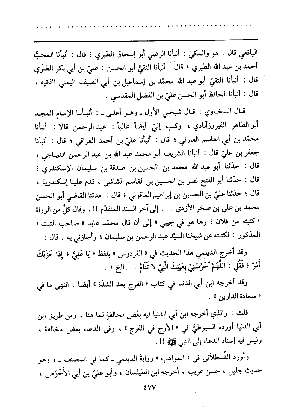 قال السخاوي: قال شيخي الأول- وهو أعلى-: أنبأنا الإمام المجد أبو الطاهر الفيروز آبادي، وكتب إليّ أيضا عاليا: عبد الرحمن قالا: أنبأنا محمّد بن أبي القاسم الفارقي؛ قال: أنبأنا عليّ بن أحمد العراقي؛ قال: أنبأنا جعفر بن عليّ قال: أنبأنا الشريف أبو محمد عبد الله بن عبد الرحمن الديباجي؛ قال: حدّثنا أبو عبد الله محمد بن الحسين بن صدقة بن سليمان الإسكندري؛ قال: حدّثنا أبو الفتح نصر بن الحسين بن القاسم الشاشي، قدم علينا إسكندرية، قال؛ حدّثنا عليّ بن الحسين بن إبراهيم العاقولي؛ قال: حدثنا القاضي أبو الحسن محمد بن علي بن صخر الأزدي ... إلى آخر السند المتقدّم!!. وقال كلّ من الرواة «كتبته من فلان؛ وها هو في جيبي» إلى أن قال محمّد عابد «صاحب الثبت» المذكور: فكتبته عن شيخنا السيّد عبد الرحمن بن سليمان؛ وأجازني به. قال: