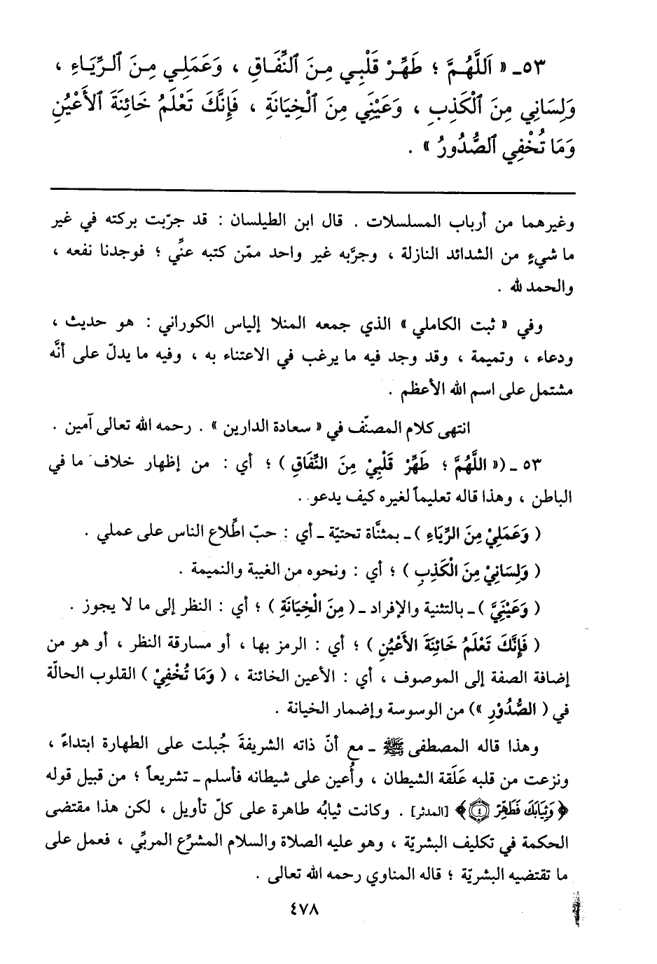 53- ( «اللهمّ؛ طهّر قلبي من النّفاق) ؛ أي: من إظهار خلاف ما في الباطن، وهذا قاله تعليما لغيره كيف يدعو.