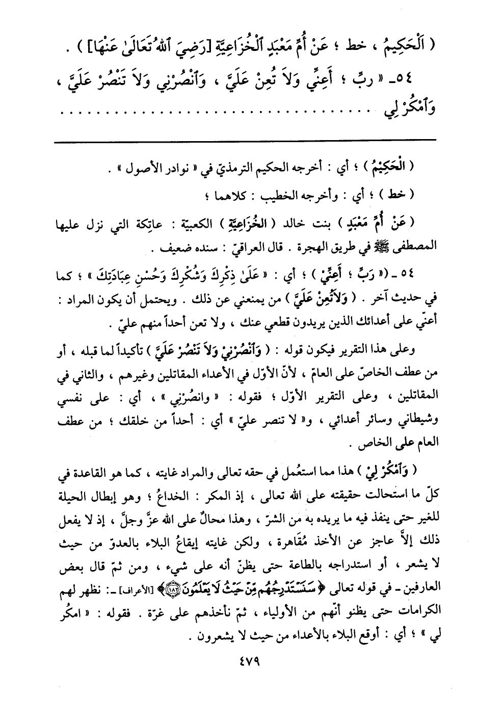 54- ( «ربّ؛ أعنّي) ؛ أي: «على ذكرك وشكرك وحسن عبادتك» ؛ كما في حديث آخر. (ولا تعن عليّ) من يمنعني عن ذلك. ويحتمل أن يكون المراد: