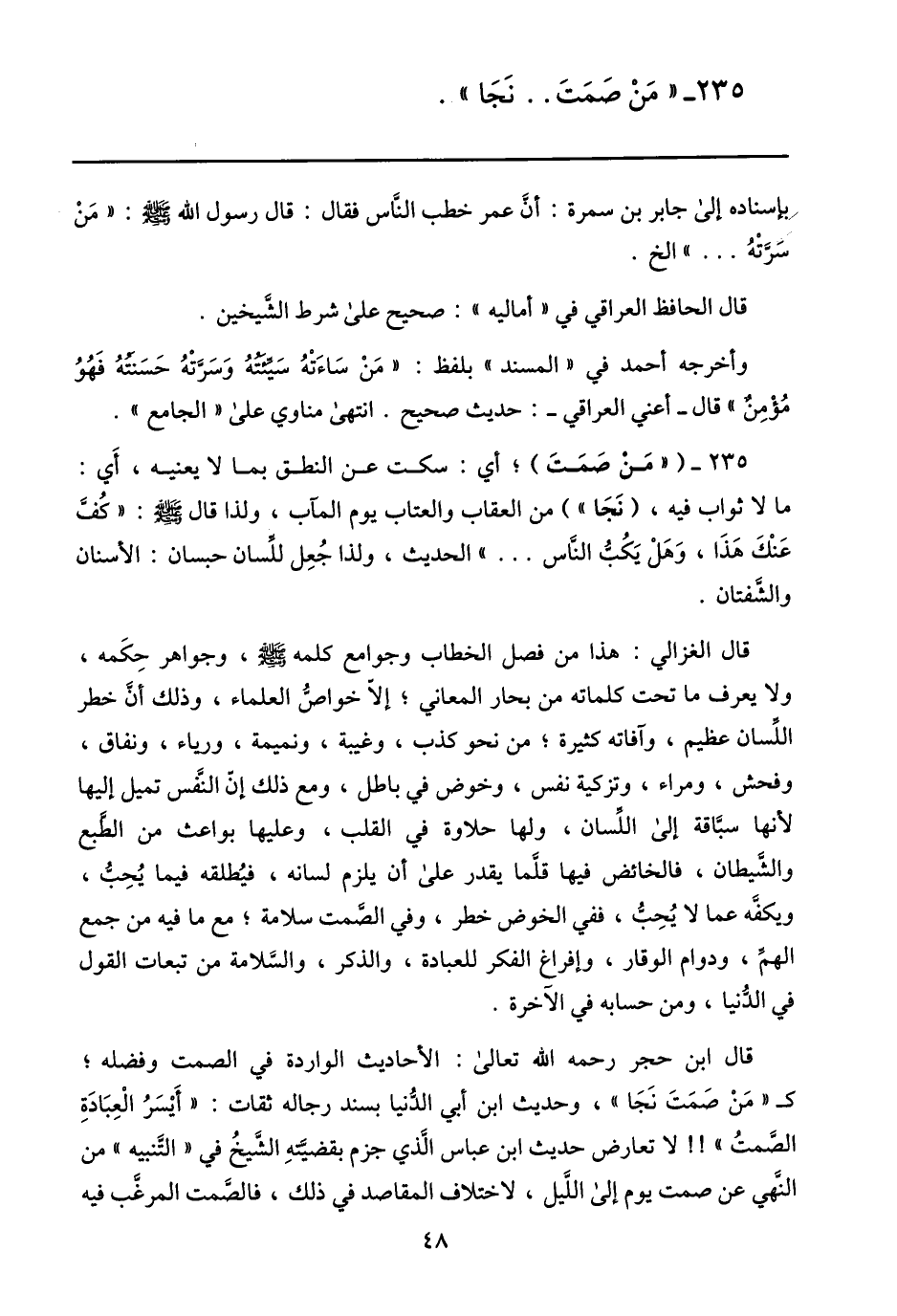235- ( «من صمت) ؛ أي: سكت عن النطق بما لا يعنيه، أي: