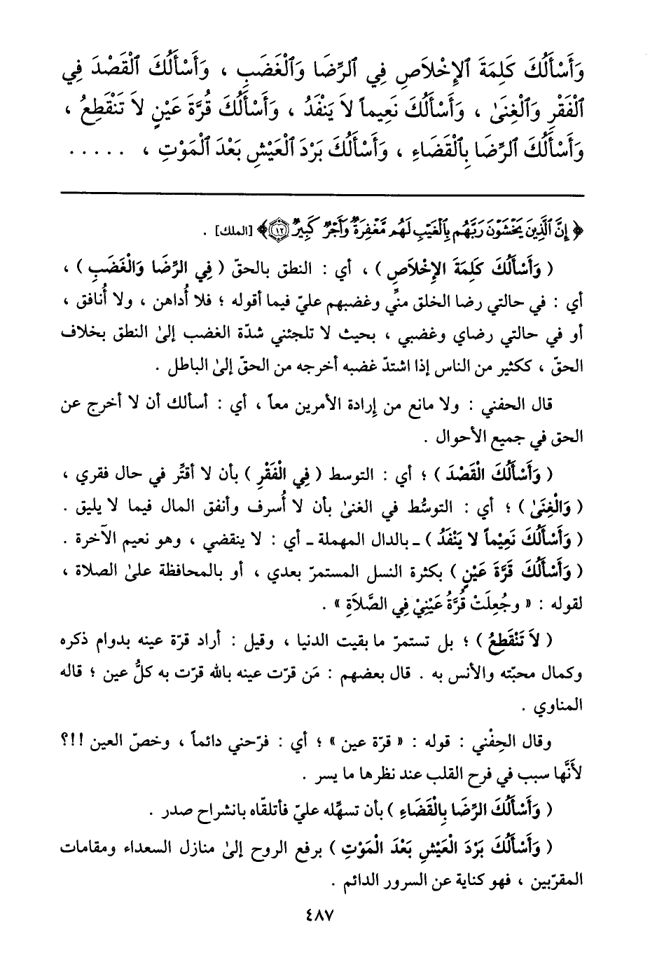 وأسألك كلمة الإخلاص في الرّضا والغضب، وأسألك القصد في الفقر والغنى، وأسألك نعيما لا ينفد، وأسألك قرّة عين لا تنقطع، وأسألك الرّضا بالقضاء، وأسألك برد العيش بعد الموت، ...