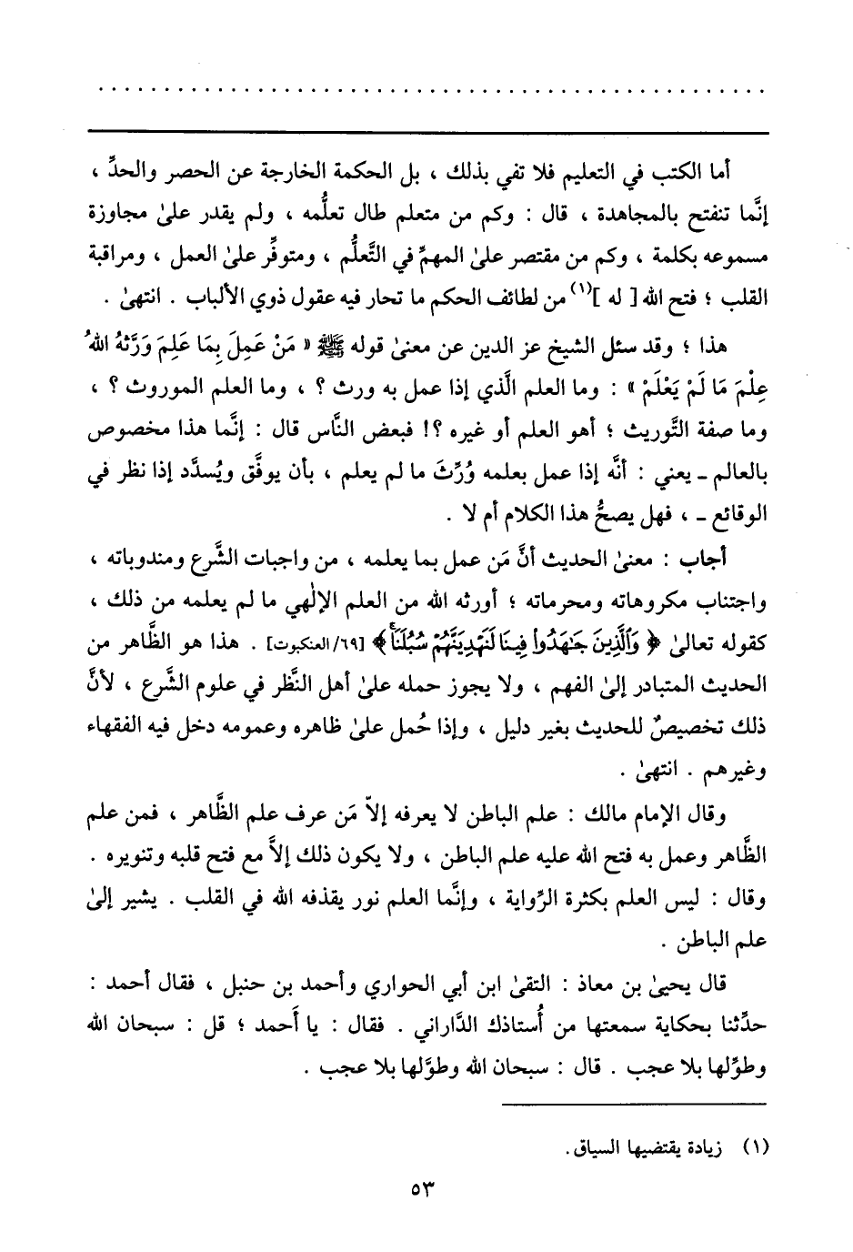 أما الكتب في التعليم فلا تفي بذلك، بل الحكمة الخارجة عن الحصر والحدّ، إنّما تنفتح بالمجاهدة، قال: وكم من متعلم طال تعلّمه، ولم يقدر على مجاوزة مسموعه بكلمة، وكم من مقتصر على المهمّ في التّعلّم، ومتوفّر على العمل، ومراقبة القلب؛ فتح الله [له] «1» من لطائف الحكم ما تحار فيه عقول ذوي الألباب. انتهى.