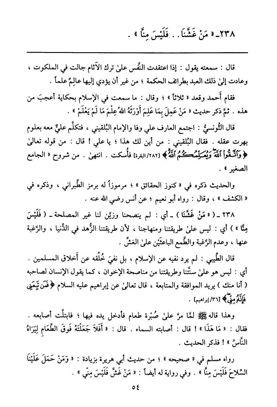 238- ( «من غشّنا) - أي: لم ينصحنا وزيّن لنا غير المصلحة- (فليس منّا» ) أي: ليس على طريقتنا ومنهاجنا، لأن طريقتنا الزّهد في الدّنيا، والرّغبة عنها، وعدم الرّغبة والطّمع الباعثين على الغشّ.