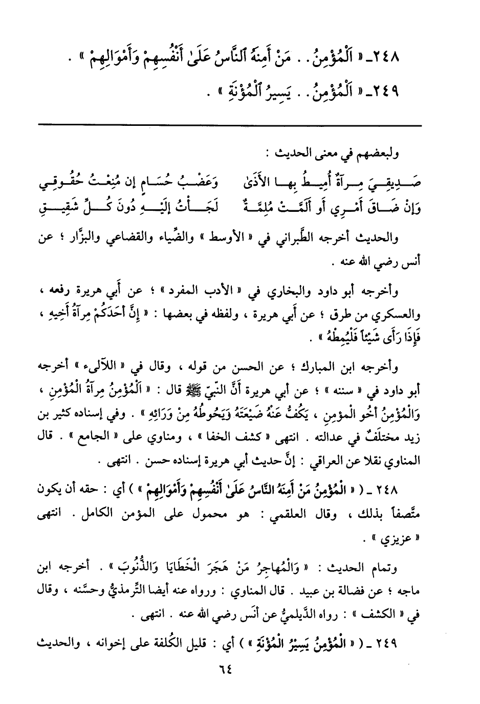 248- ( «المؤمن من أمنه النّاس على أنفسهم وأموالهم» ) أي: حقه أن يكون متّصفا بذلك، وقال العلقمي: هو محمول على المؤمن الكامل. انتهى «عزيزي» .