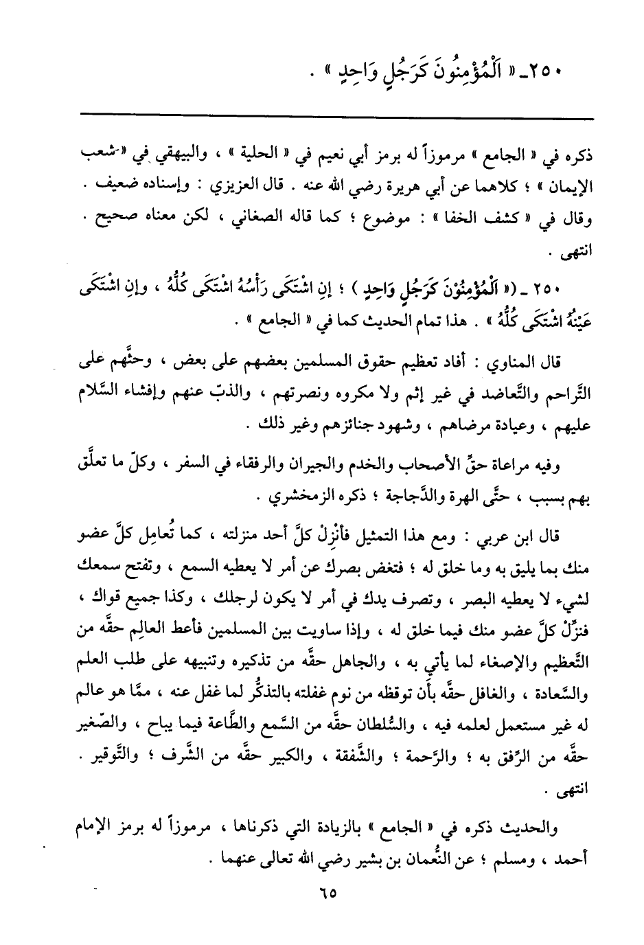 250- ( «المؤمنون كرجل واحد) ؛ إن اشتكى رأسه اشتكى كلّه، وإن اشتكى عينه اشتكى كلّه» . هذا تمام الحديث كما في «الجامع» .