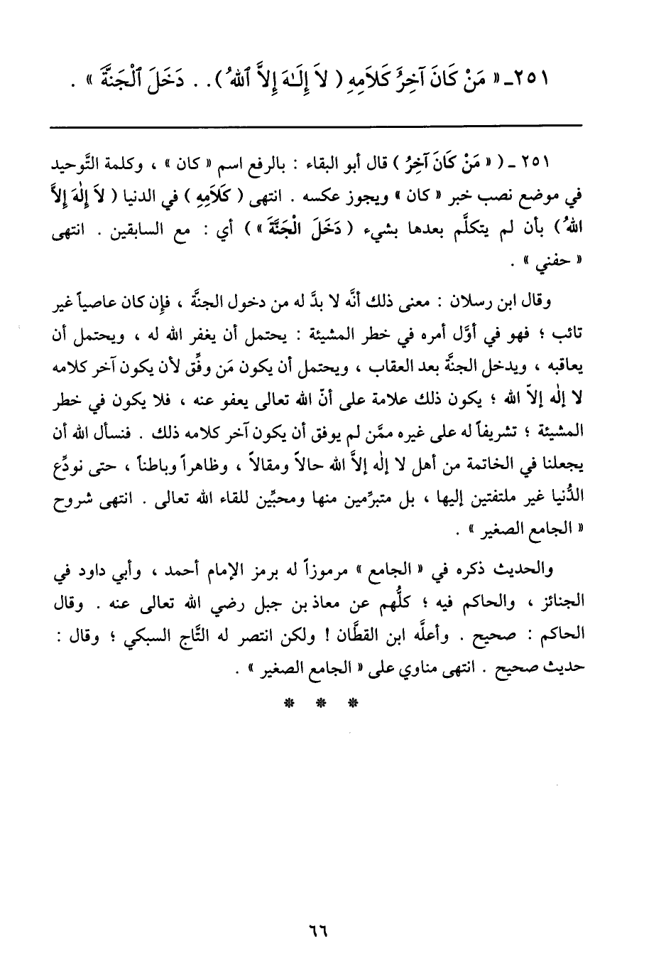 251- ( «من كان آخر) قال أبو البقاء: بالرفع اسم «كان» ، وكلمة التّوحيد في موضع نصب خبر «كان» ويجوز عكسه. انتهى (كلامه) في الدنيا (لا إله إلّا الله) بأن لم يتكلّم بعدها بشيء (دخل الجنّة» ) أي: مع السابقين. انتهى «حفني» .