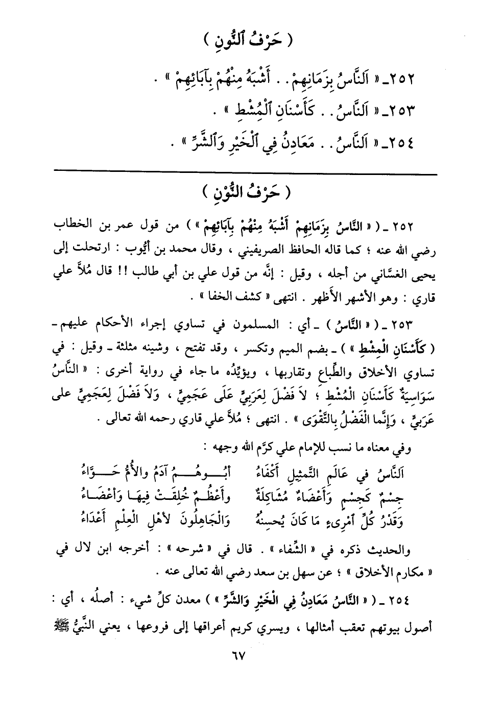 (حرف النّون) 252- ( «النّاس بزمانهم أشبه منهم بابائهم» ) من قول عمر بن الخطاب رضي الله عنه؛ كما قاله الحافظ الصريفيني، وقال محمد بن أيّوب: ارتحلت إلى يحيى الغسّاني من أجله، وقيل: إنّه من قول علي بن أبي طالب!! قال ملّا علي قاري: وهو الأشهر الأظهر. انتهى «كشف الخفا» .