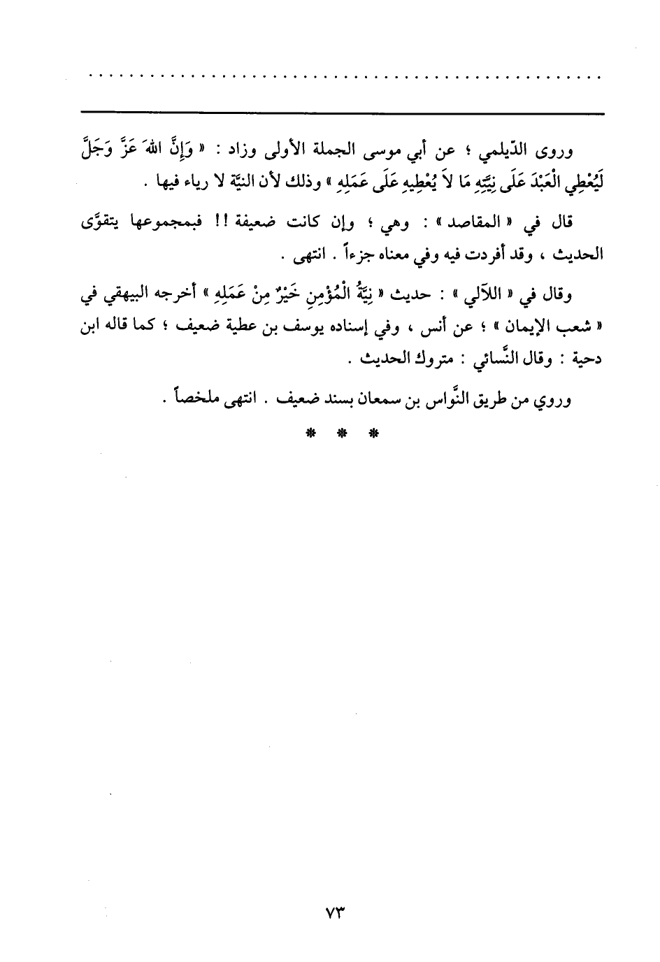 وقال في «اللآلي» : حديث «نيّة المؤمن خير من عمله» أخرجه البيهقي في «شعب الإيمان» ؛ عن أنس، وفي إسناده يوسف بن عطية ضعيف؛ كما قاله ابن دحية: وقال النّسائي: متروك الحديث.